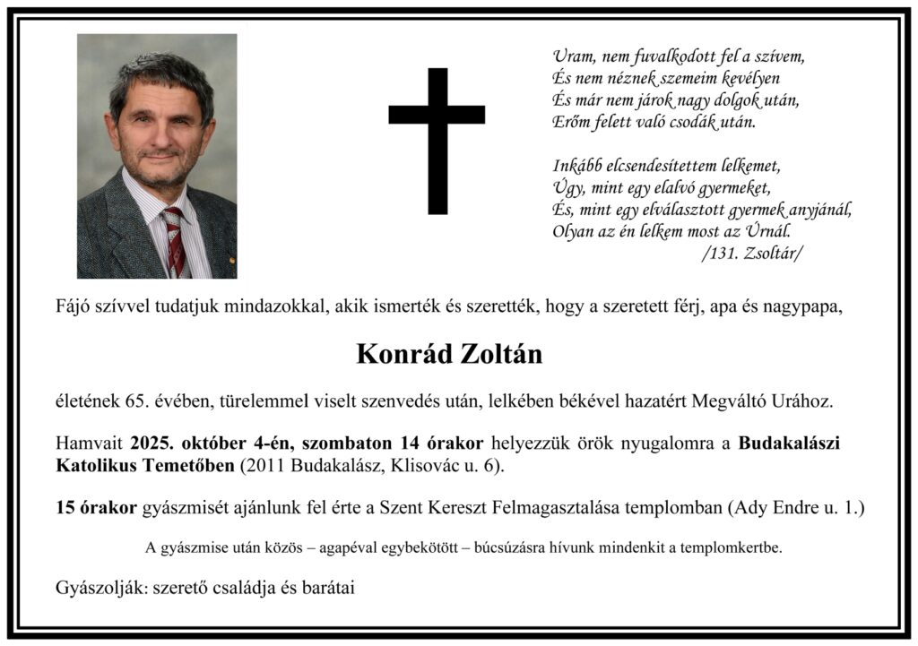 Mély fájdalommal tudatjuk, hogy végső búcsút kell vennünk Konrád Zoltán tanár úrtól, aki 1985-2012-ig iskolánk tanára, osztályfőnöke és meghatározó személyisége volt.